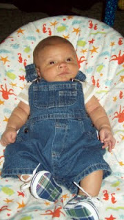 He no longer can fit into 0-3 month clothes. Right now he is in 3-6 month clothes. He is getting bigger by the second as you can see in the picture. This picture was taken this morning. His belly aches have gotten better. Our friend and NP Tabby said to add pear juice to his bottle when we give him one at night and it should help his stomach. It really has helped him!!!